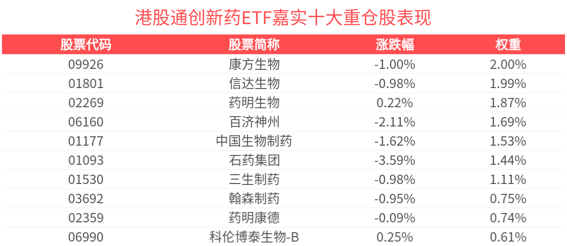 数据显示,截至2025年9月30日,中证港股通创新药指数(931250)前十大权重股分别为药明生物、信达生物、百济神州、康方生物、中国生物制药、石药集团、三生制药、药明康德、翰森制药、科伦博泰生物-B,前十大权重股合计占比70.6%。