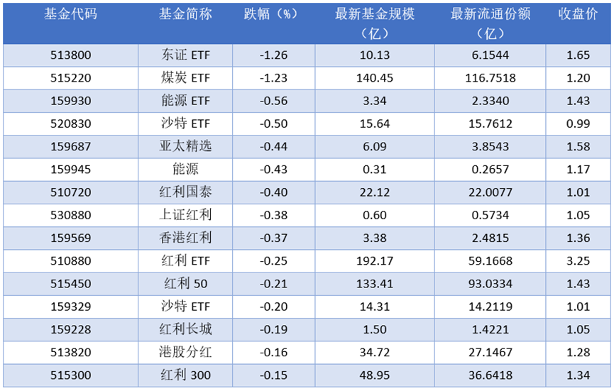 下跌方面,2025年10月21日跌幅最大的是东证ETF (513800),跌幅达到1.26%。排名靠前的煤炭ETF (515220)、能源ETF(159930)、沙特ETF (520830),跌幅分别为1.23%、0.56%、0.50%。