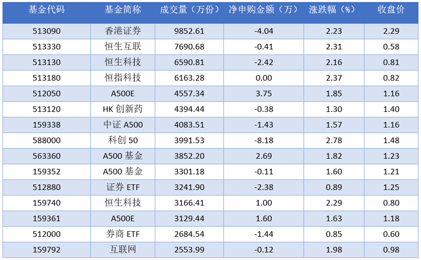从成交量上来看,2025年10月21日成交量最大的是香港证券(513090),成交量为9852.61万份。排名靠前的恒生互联(513330)、恒生科技(513130)、恒指科技(513180),成交量分别为7690.68万份、6590.81万份、6163.28万份。