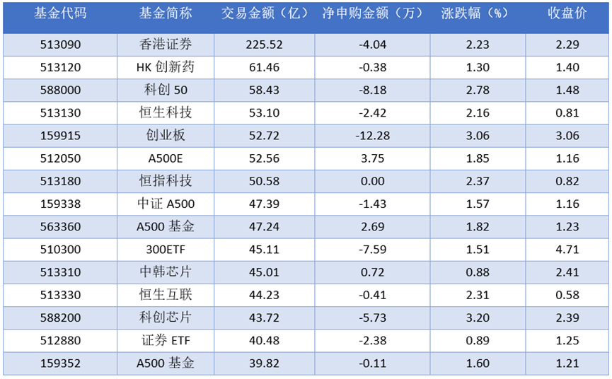 从成交金额上来看,2025年10月21日成交额最大的是香港证券(513090),交易金额225.52亿元。排名靠前的HK创新药(513120)、科创50 (588000)、恒生科技(513130),成交额分别为61.46亿元、58.43亿元、53.10亿元。