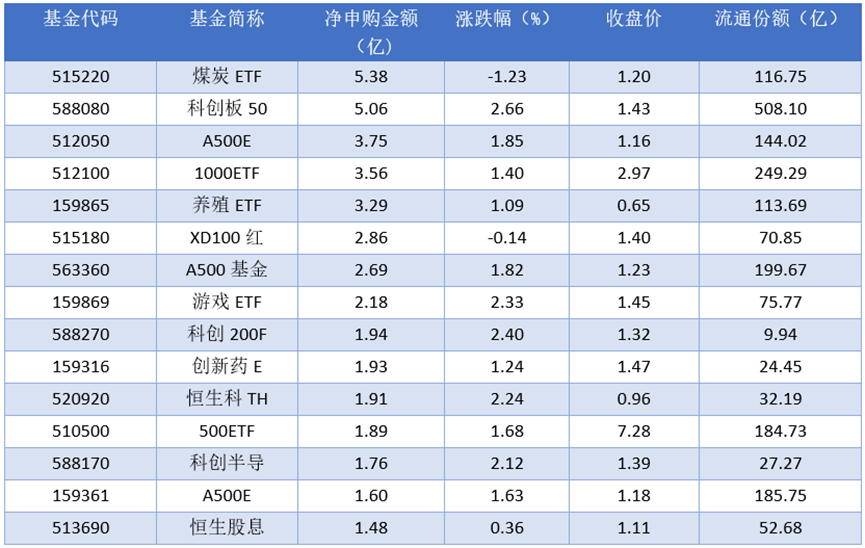 细分到资金流动情况上来看,2025年10月21日净申购金额最大的为煤炭ETF (515220),当日净申购金额为5.38亿元。排名靠前的科创板50(588080)、A500E (512050)、1000ETF (512100),申购金额为5.06亿元、3.75亿元、3.56亿元。