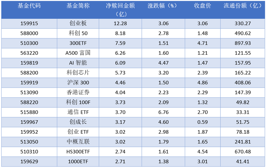 资金流出方面,2025年10月21日净赎回金额最多的是创业板(159915),赎回金额12.28亿元。排名靠前的科创50 (588000)、300ETF (510300)、A500富国(563220),赎回金额分别为8.18亿元、7.59亿元、6.26亿元。