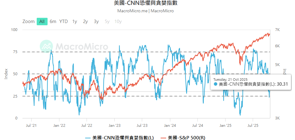 此外观察CNN恐惧贪婪指数,此前市场几乎维持贪婪至极度贪婪区间,目前录得30.31,虽有收敛但仍然处于恐慌区间。