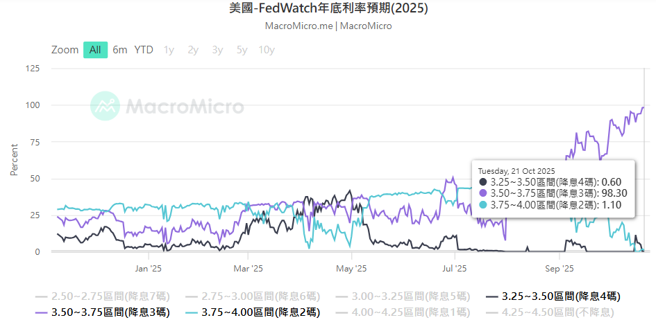 (当前市场预期美联储至2025年底一共降息100个基点的概率为0.6%、75个基点的概率为98.3%、降息50个基点的概率为1.1%、降息25个基点的概率为0.0%,预期降息幅度较上周上升)