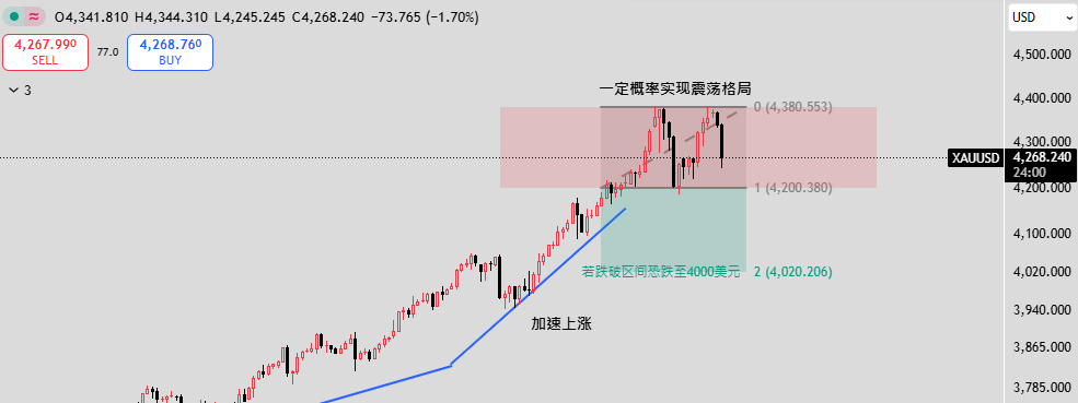 在4小时线级别的技术分析上,黄金在大级别确实做出双顶格局(看跌),但目前仍未跌破4200美元,倘若跌破则暗示顶部的震荡区间结束,恐将进一步下跌至4020美元一带。此外在10月15日以及10月8日的市场分析中有反复提及,如此强劲的上涨趋势几乎不可能持续,因此本周在交易的思路上需稍做改变。