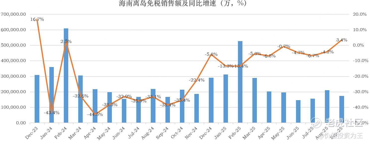 根据海关数据显示,今年9月,海南离岛免税销售额为17.3亿,同比增长3.4%,为连续下滑18个月后,首次转正: