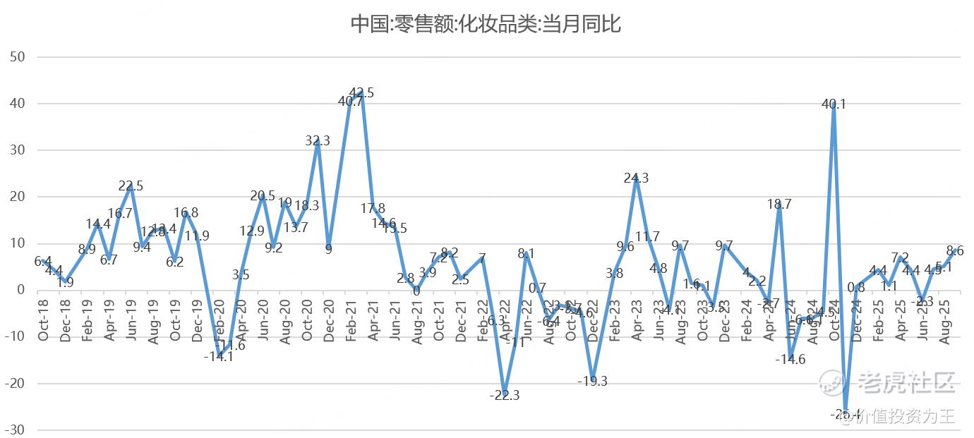 根据统计局的数据,9月国内化妆品零售额同比增长8.6%,创近一年来最快增速,远好于整体零售额3%的增长: