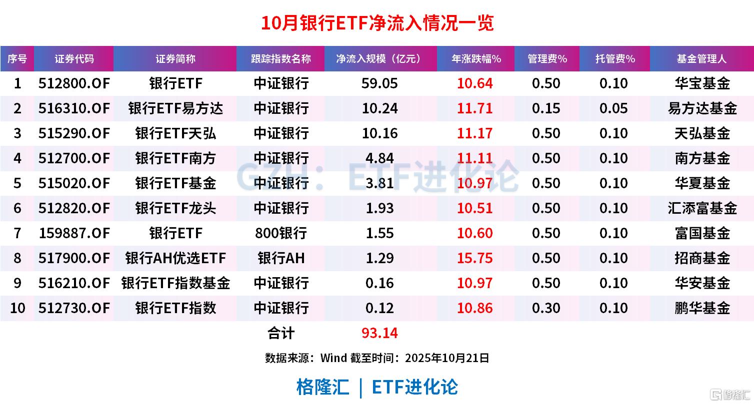 资金也在借道ETF布局银行股,截至10月21日,10只银行主题ETF在10月合计净流入93.14亿元。