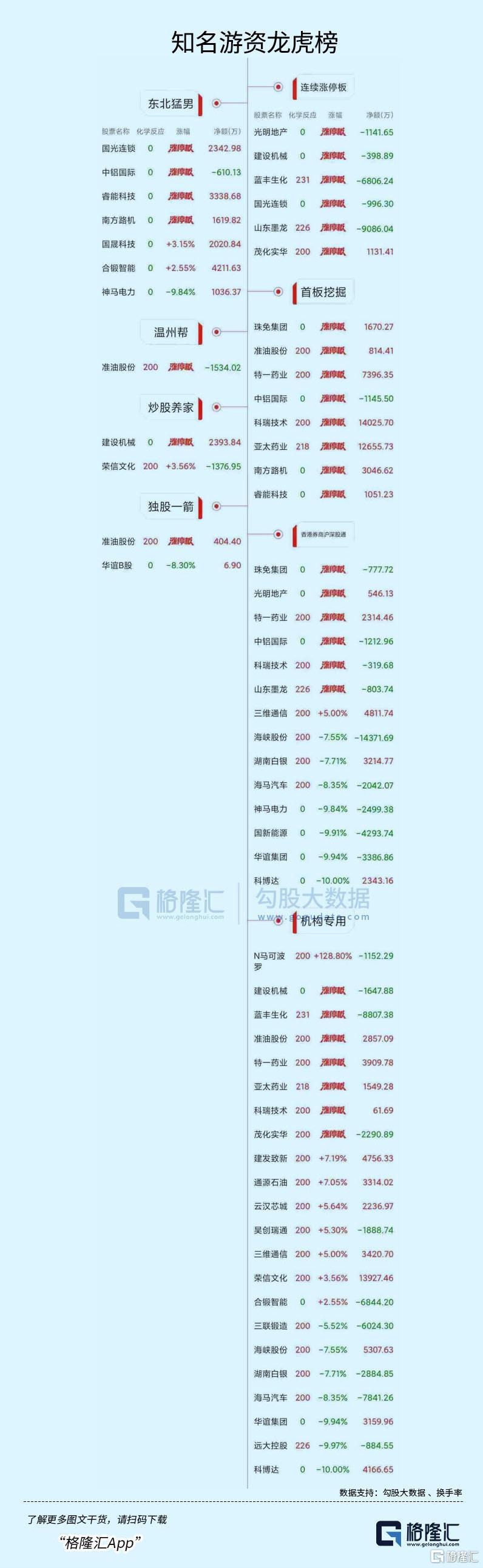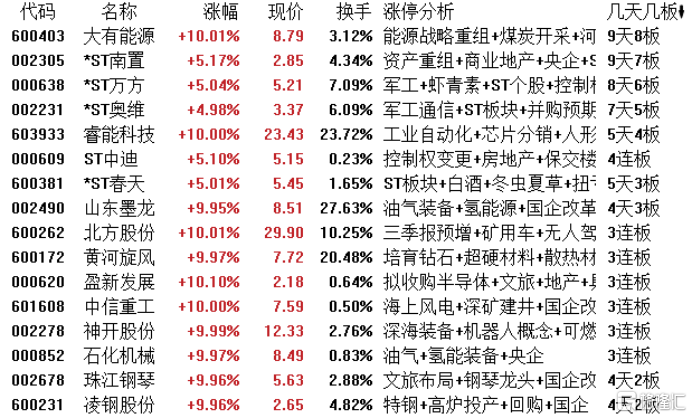 高位股方面,大有能源9天8板,*ST南置9天7板,*ST万方8天6板,*ST奥维7天5板,睿能科技5天4板,ST中迪4连板,*ST春天5天3板,山东墨龙4天3板,北方股份、黄河旋风等3连板。