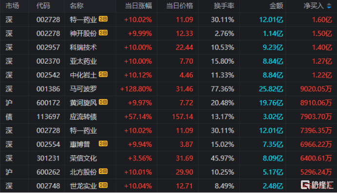 特一药业:今日涨停,全天换手率30.11%,成交额12.01亿元。机构净买入3909.77万元,深股通净买入2314.46万元,营业部席位合计净买入1172.12万元。