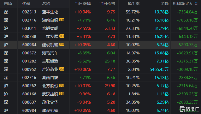 龙虎榜中涉及机构专用席位的个股中,当日净卖出额前三为蓝丰生化、合锻智能、海马汽车,分别为7354.84万元、6844.2万元、3629.91万元。