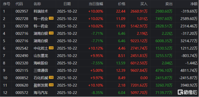 龙虎榜中涉及机构专用席位的个股中,当日净买入额前三为荣信文化、科博达、特一药业,分别为1.11亿元、4166.65万元、3909.77万元。