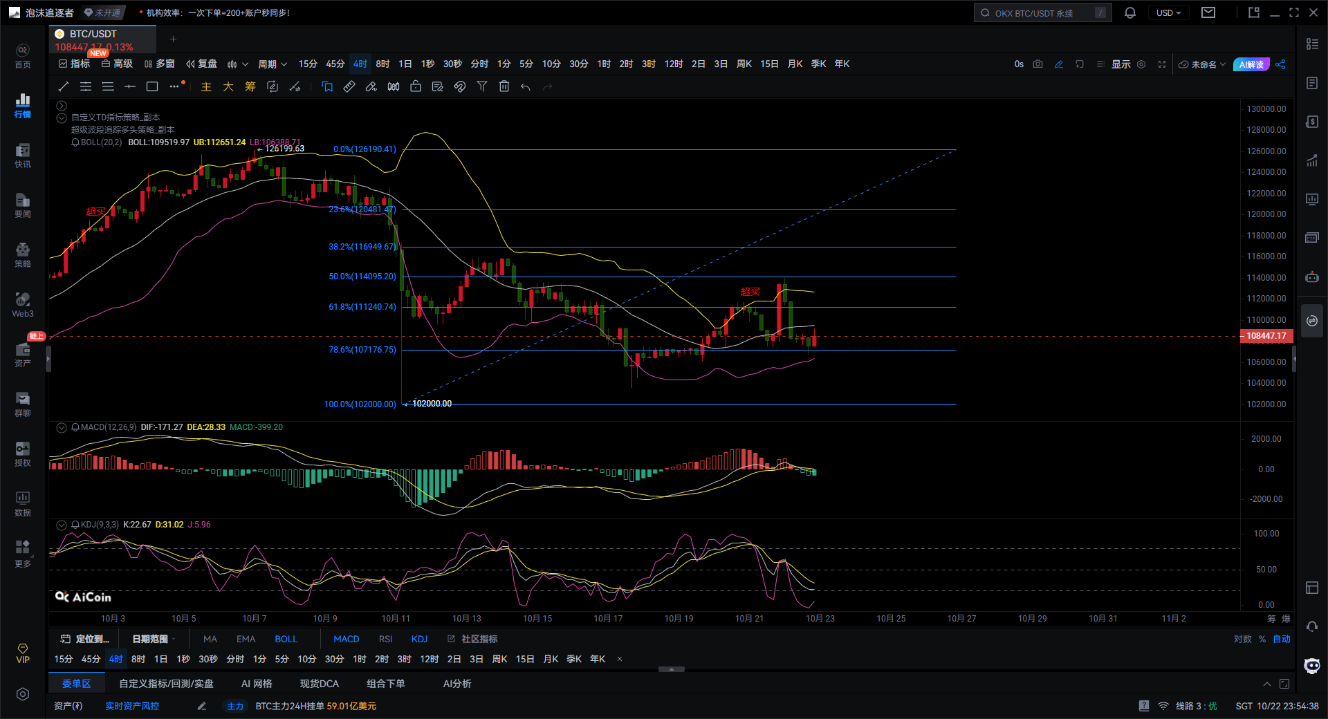 价格目前在斐波那契61.8%-78.6%回撤区间震荡,这是重要的支撑区域。守住107000-108000区间可能引发反弹测试114000的50%回撤位,跌破则可能下探102000低点。