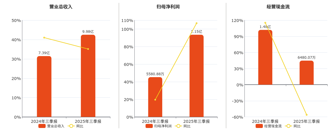 公司营业总收入为9.98亿元,较去年同报告期营业总收入增加2.59亿元,实现5年连续上涨,同比较去年同期上涨35.11%。归母净利润为1.15亿元,较去年同报告期归母净利润增加5950.00万元,实现2年连续上涨,同比较去年同期上涨106.61%。经营活动现金净流入为6480.07万元。