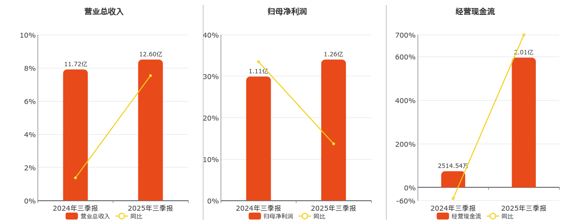 公司营业总收入为12.60亿元,较去年同报告期营业总收入增加8827.57万元,实现5年连续上涨,同比较去年同期上涨7.53%。归母净利润为1.26亿元,较去年同报告期归母净利润增加1517.18万元,实现5年连续上涨,同比较去年同期上涨13.68%。经营活动现金净流入为2.01亿元,较去年同报告期经营活动现金净流入增加1.76亿元,同比较去年同期上涨699.09%。