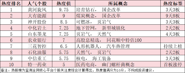 今日,A股十大人气热股如下:黄河旋风、大有能源、神开股份、中化岩土、山东墨龙、农业银行、三花智控、石化油服、中信重工、特一药业。