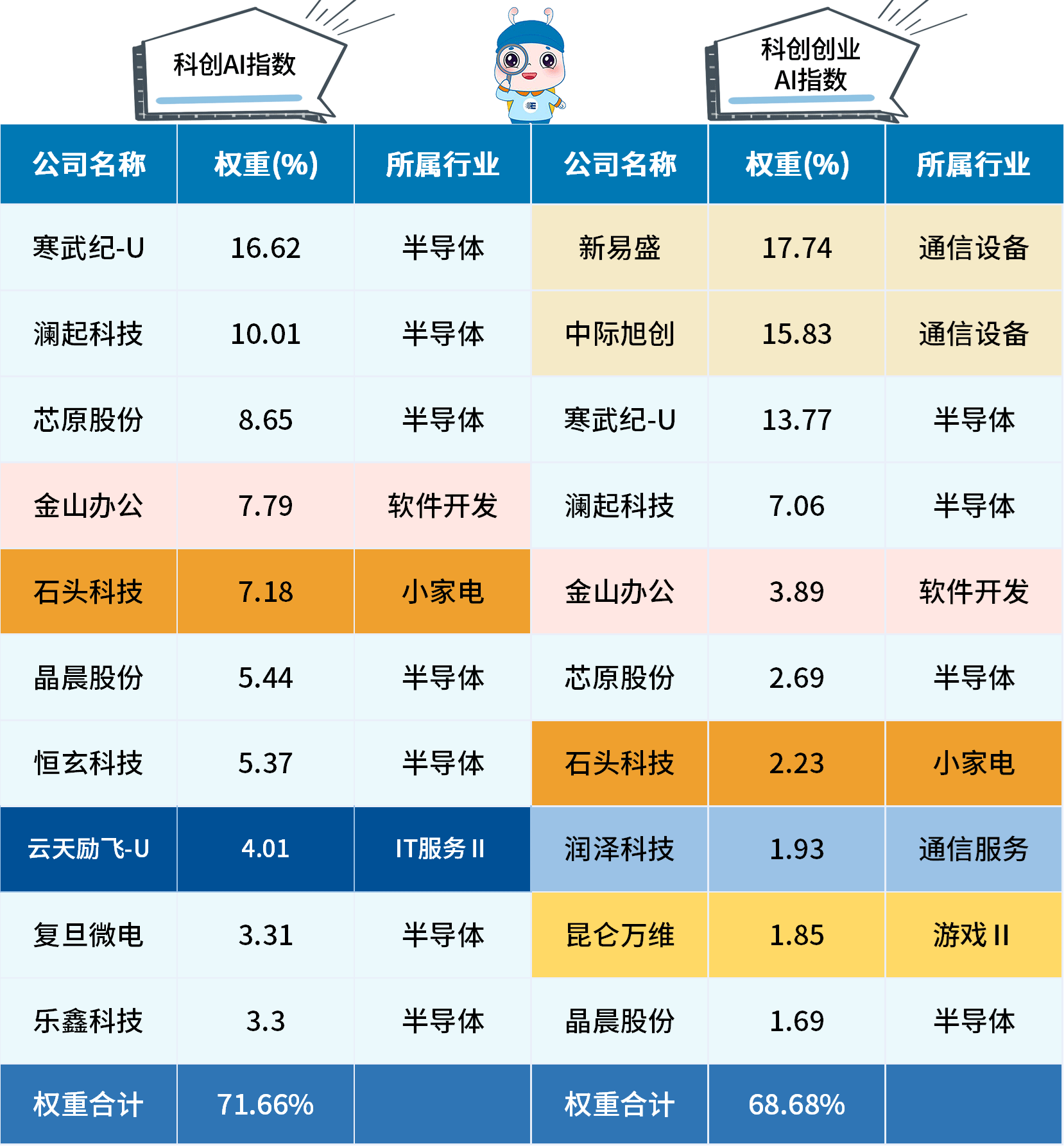 总结而言,科创 AI 指数的成份股更聚焦科创板硬科技,侧重AI芯片与应用端;科创创业 AI 指数则兼顾科创板与创业板,行业分布更均衡,覆盖了通信设备、AI多元应用等行业领域,形成了跨板块、多行业的成份股矩阵。