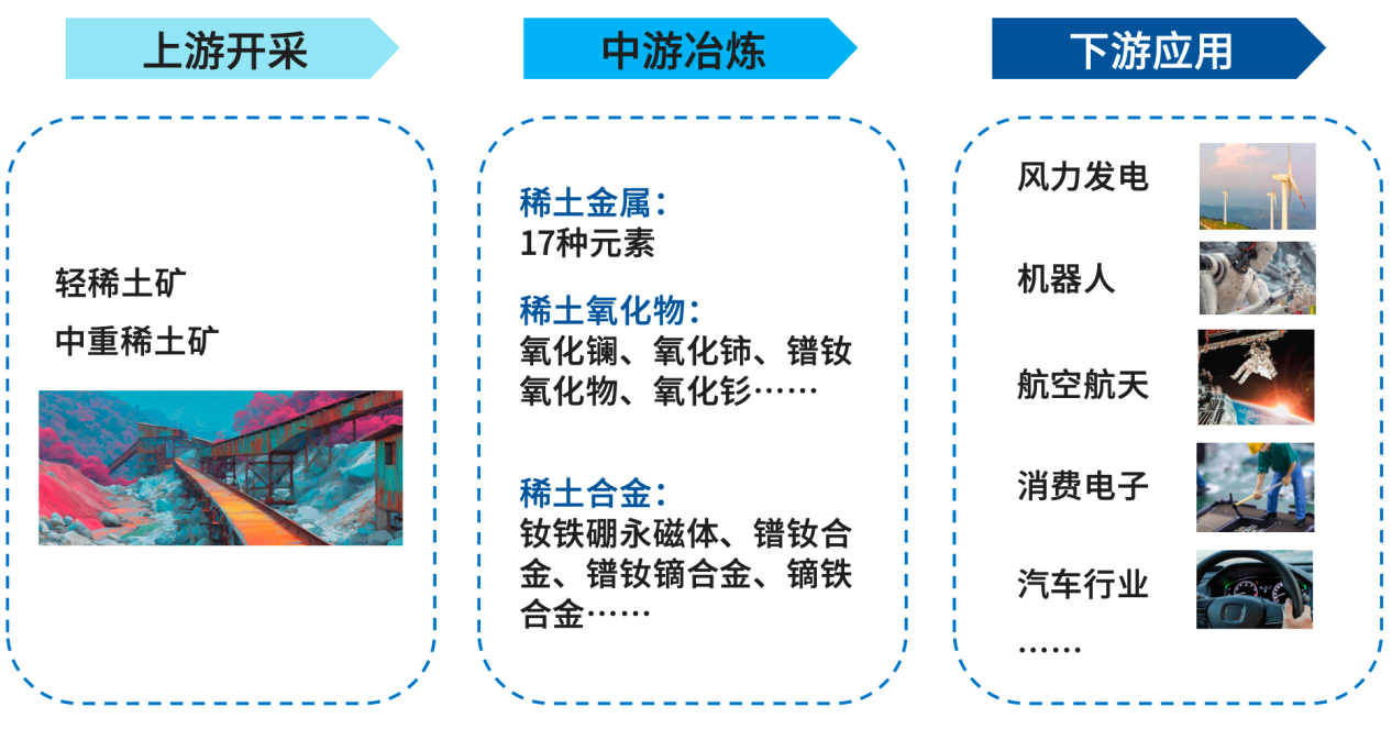 从产业链上看,上游主要是从稀土矿山中勘探、开采出稀土原矿;
