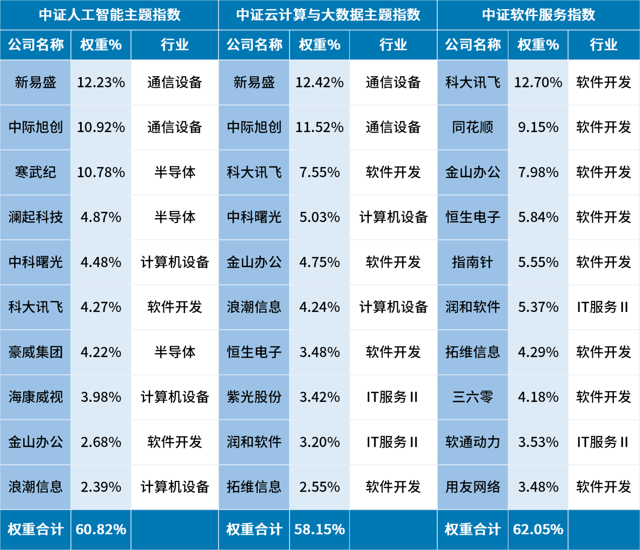三只指数前十大重仓股中,有部分行业龙头企业股票互相重合,如科大讯飞、金山办公等,三只指数受行业龙头企业表现的影响都比较大。