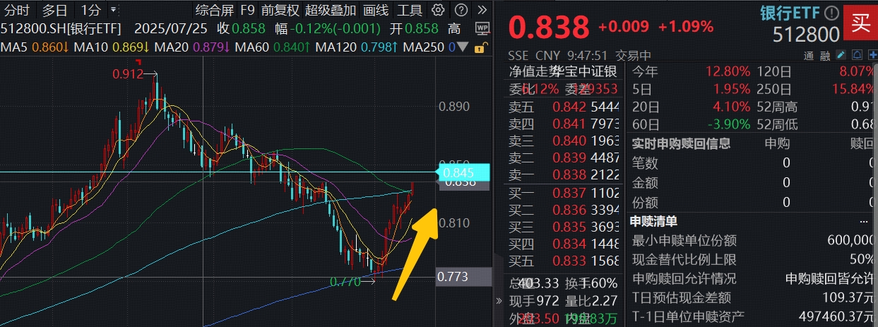 ETF盘中资讯|迅速突破,双百亿银行ETF(512800)续涨逾1%,站上半年线!农业银行15连阳,累计涨幅近25%