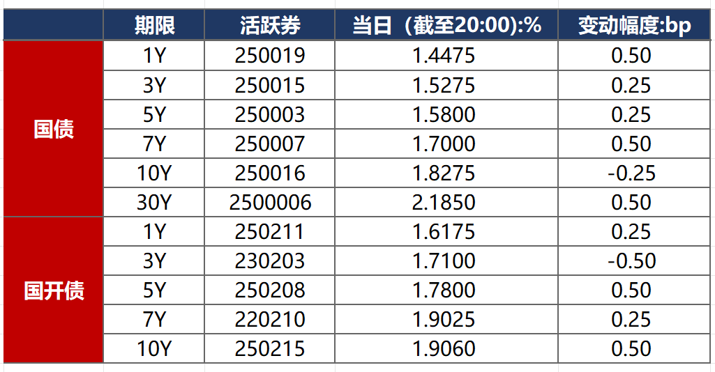 10月22日,债市窄幅调整。截至北京时间20:00,10年期国债活跃券250016收益率下行0.25bp至1.8275%,10年期国开债活跃券250215收益率上行0.50bp至1.9060%。