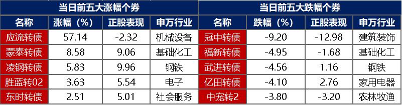 【转债市场主要指数集体跟跌】 10月22日,转债市场跟随权益市场有所下跌,当日中证转债、上证转债、深证转债分别收跌0.39%、0.35%、0.46%。当日,转债市场成交额561.54亿元,较前一交易日缩量93.93亿元。转债市场个券多数下跌,416支转债中,99支收涨,304支下跌,13支持平。当日上涨个券中,新上市应流转债涨超57%,蒙泰转债涨超8%,凌钢转债涨超5%;下跌个券中,冠中转债跌逾9%,福新转债、武进转债、亿田转债跌逾4%。