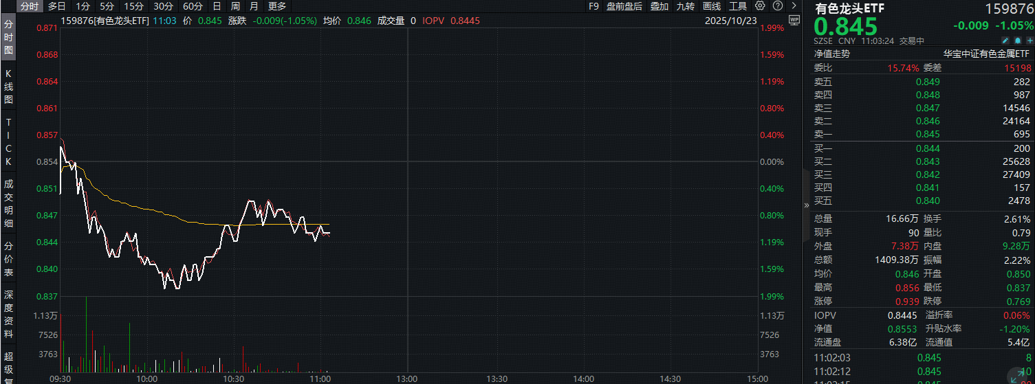 或受黄金震荡扰动,叠加大盘情绪低迷,今日(10月23日)揽尽有色金属行业龙头的有色龙头ETF(159876)随市盘整回调,场内价格现跌1.05%。