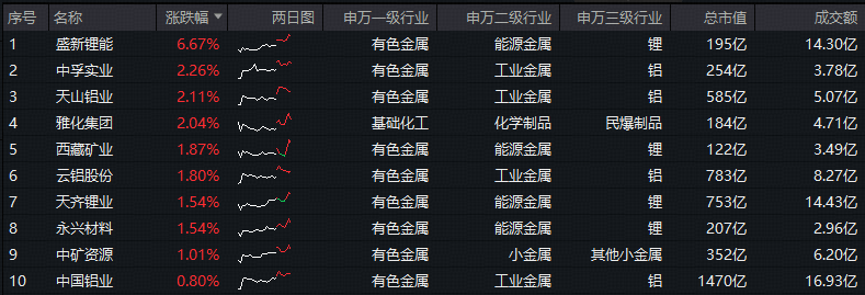 成份股来看,锂、铝等方向局部活跃。锂业龙头方面,盛新锂能领涨超6%;西藏矿业、天齐锂业、永兴材料涨逾1%;铝业龙头方面,中孚实业涨超2%,云铝股份涨逾1%。另一方面,楚江新材跌超4%,白银有色、云南锗业、湖南黄金、中金黄金等个股跌幅居前,拖累指数表现。