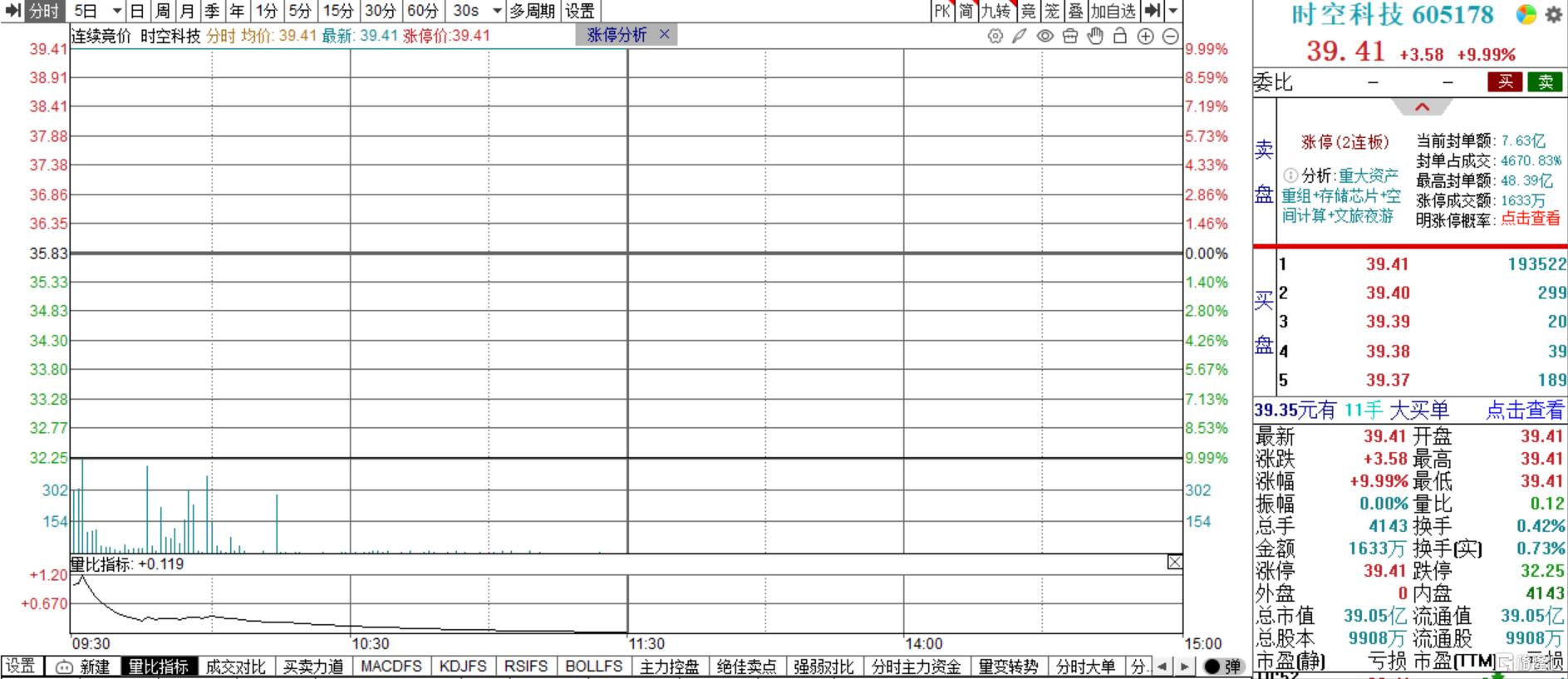 时空科技今日复牌后一字涨停,报39.41元/股,总市值为39.05亿元。今年以来,股价累计涨幅超174%。