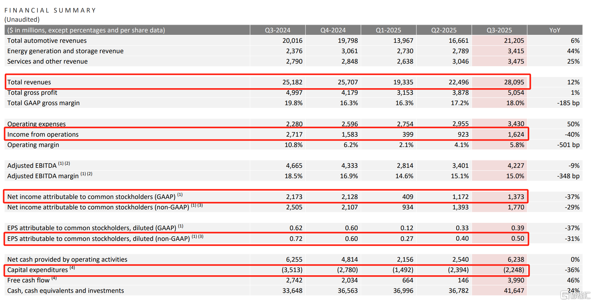 当地时间10月22日,特斯拉公布了2025年第三季度财报。报告显示,公司实现营业总收入280.95亿美元,不仅高于市场预期的263.7亿美元,也较去年同期的251.82亿美元增长11.6%。