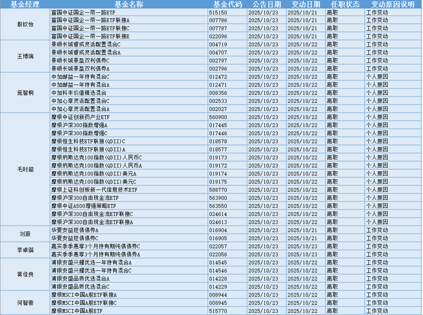 根据巨灵统计的数据显示,近30天(9.24-10.23)共有469只基金产品的基金经理发生离职变动。其中今天(10.23)有51只基金产品发布基金经理离职公告,从变动原因上来看,有9位基金经理是由于工作变动而从管理的32只基金产品中离职。有2位基金经理是由于个人原因而从管理的19只基金产品中离职。
