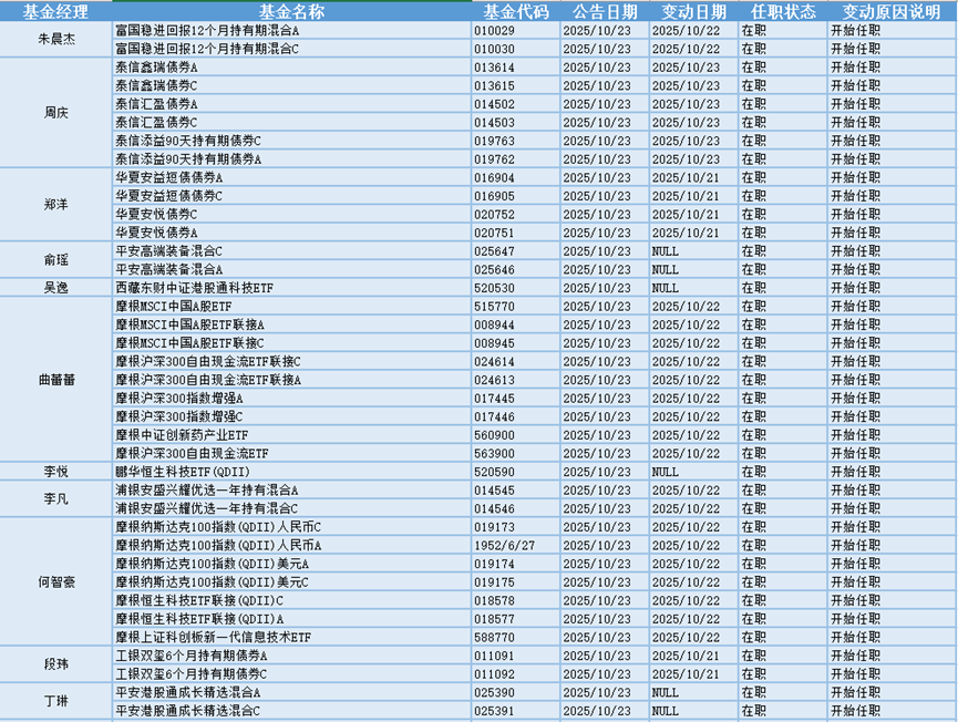 新基金经理上任方面,东财基金吴逸现任基金资产总规模为87.76亿元,管理过的基金多为指数型和混合型基金,任职期间回报最高的产品是西藏东财中证芯片产业ETF(159599),为债券型基金,在任职的1年又119天时间内获得108.48%的回报,至今仍在管理该基金。新上任西藏东财中证港股通科技ETF这只基金产品的基金经理。