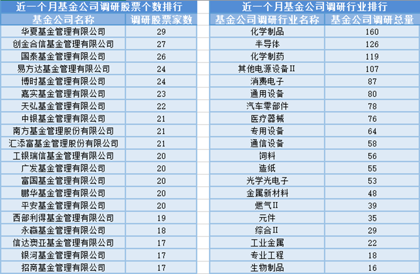 近一个月(9月24日-10月23日),华夏基金参与公司调研的数量最多,共调研29家上市公司,然后调研较为活跃的还有创金合信基金、国泰基金和易方达基金,分别调研27家、26家、24家上市公司;从调研行业上来看,基金公司对化学制品行业的上市公司调研次数最多,共有160次,其次是半导体行业,基金公司调研了126次。