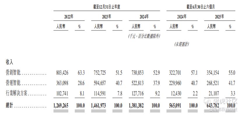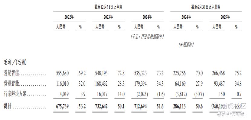 从收入结构来看,公司“营销+营运”业务双轮驱动。2022年至2024年,营销智能业务收入分别为8.03亿元、7.53亿元、7.31亿元,占总收入比例分别为63.3%、51.5%、52.9%,2025年上半年达3.54亿元,占比为55.0%,始终为第一大收入来源;营运智能业务收入分别为3.63亿元、5.95亿元、5.23亿元,占比分别为28.6%、40.7%、37.9%。
