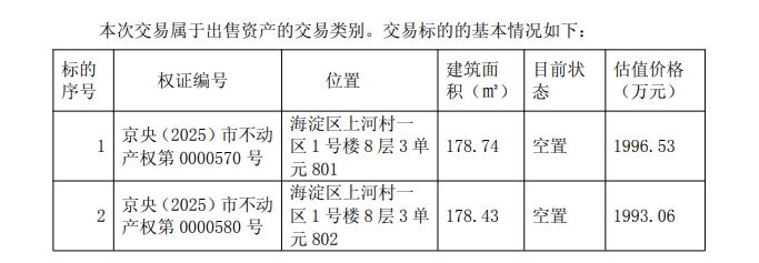 根据资产评估显示,截至估值基准日2025年7月31日,上述两套房产房地合一的市场价值(含增值税)合计为3989.59万元,增值额为3865.18万元,增值率为3106.89%。若依此计算,这两套房产挂牌的单价约为11.17万元/平方米,在23年时间中升值超13.5倍。