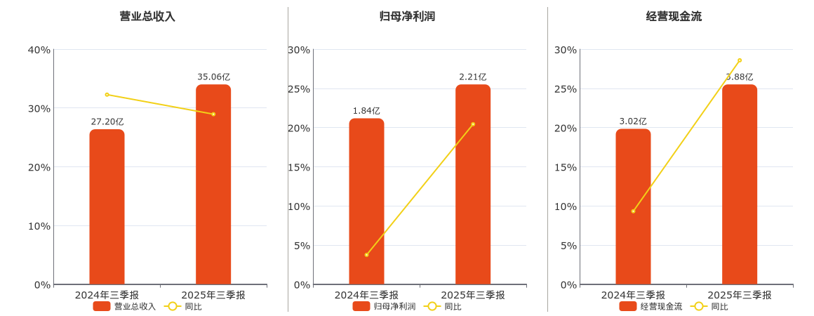 公司营业总收入为35.06亿元。归母净利润为2.21亿元。经营活动现金净流入为3.88亿元。