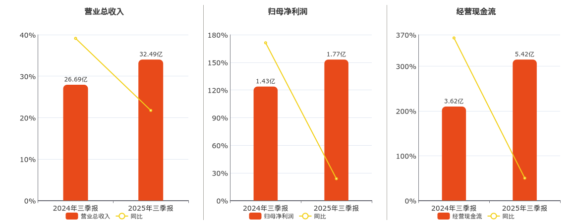 公司营业总收入为32.49亿元,较去年同报告期营业总收入增加5.80亿元,实现2年连续上涨,同比较去年同期上涨21.73%。归母净利润为1.77亿元,较去年同报告期归母净利润增加3382.97万元,实现2年连续上涨,同比较去年同期上涨23.69%。经营活动现金净流入为5.42亿元,较去年同报告期经营活动现金净流入增加1.81亿元,实现2年连续上涨,同比较去年同期上涨49.97%。