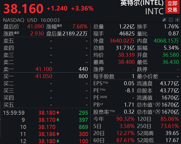 科技股全线走强,英特尔财报超预期盘后一度暴涨超9%