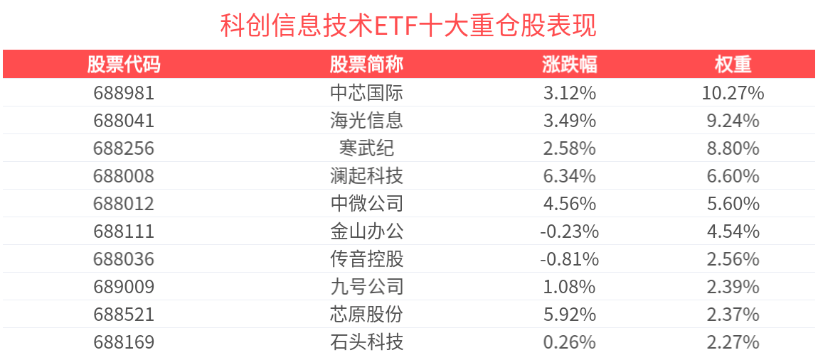 数据显示,截至2025年9月30日,上证科创板新一代信息技术指数前十大权重股分别为海光信息、中芯国际、寒武纪、澜起科技、中微公司、金山办公、芯原股份、华虹公司、石头科技、传音控股,前十大权重股合计占比57.93%。