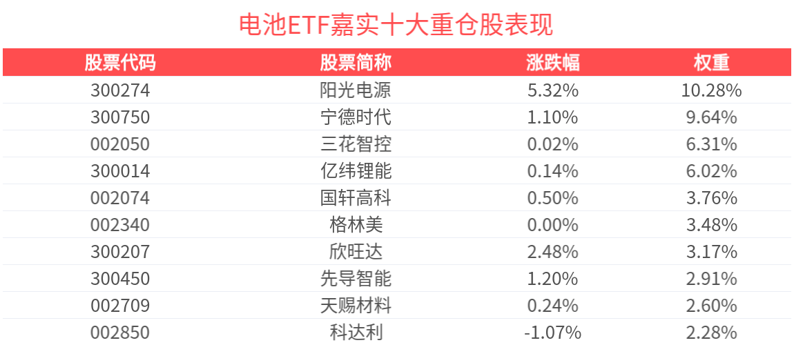 数据显示,截至2025年9月30日,中证电池主题指数前十大权重股分别为阳光电源、宁德时代、亿纬锂能、三花智控、先导智能、天赐材料、国轩高科、欣旺达、格林美、科达利,前十大权重股合计占比55.79%。