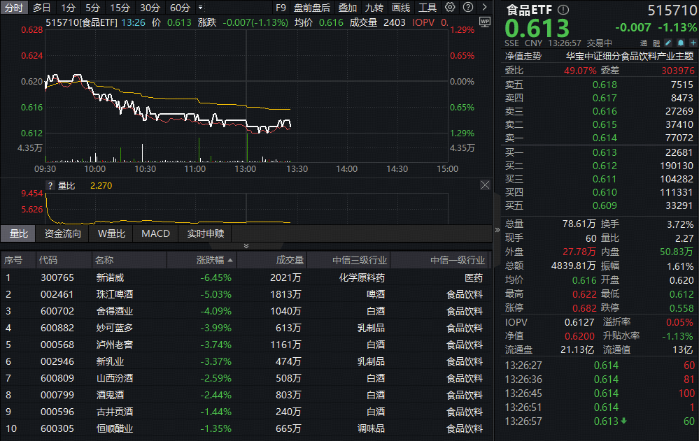 成份股方面,白酒、大众品均表现不佳。截至发稿,珠江啤酒大跌超5%,舍得酒业跌超4%,妙可蓝多、泸州老窖、新乳业等多股跟跌超3%,拖累板块走势。