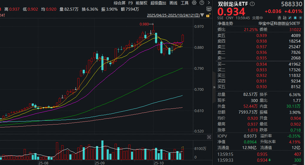 新五年规划提出,未来10年,将再造一个中国高技术产业。今日(10月24日)百分百布局新质生产力的双创龙头ETF(588330)场内价格盘中豪涨超4.2%,现涨4.01%,站稳20日均线,实时成交额超7500万元,已超昨日全天成交额,技术面显示短期趋势转强!