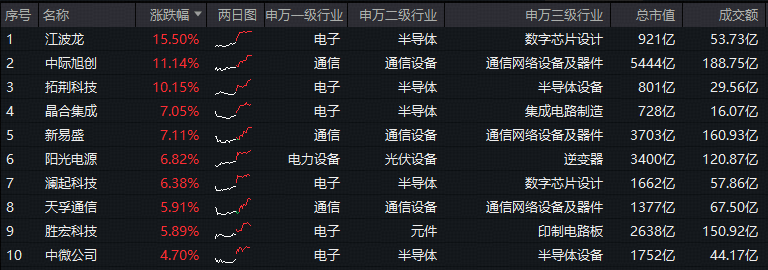 成份股方面,半导体和光模块携手领涨。半导体龙头方面,江波龙涨超15%,拓荆科技涨逾10%,晶合集成涨逾7%;光模块三巨头方面,中际旭创涨超11%创新高,新易盛涨逾7%,天孚通信涨近6%。光伏龙头阳光电源涨超6%,PCB(印制电路板)龙头涨逾5%。
