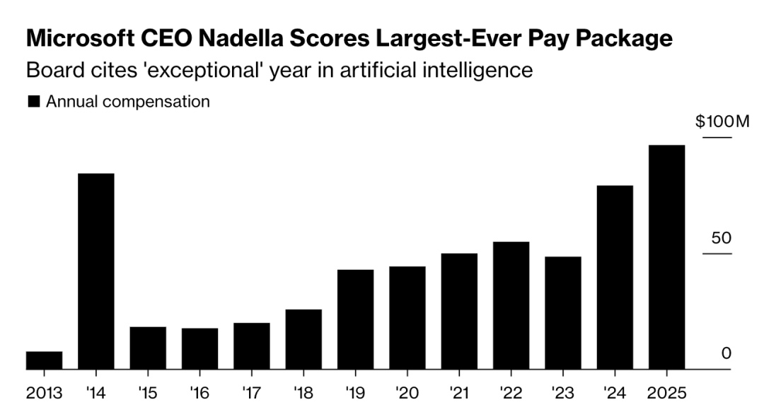 微软CEO纳德拉的薪酬高于苹果CEO蒂姆·库克、英伟达CEO黄仁勋。