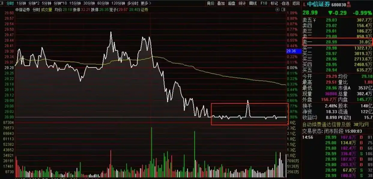 与此同时,中信证券尾盘成交额急剧放大,在尾盘3分钟集合竞价阶段,中信证券成交了11.27万手,约3.3亿元。
