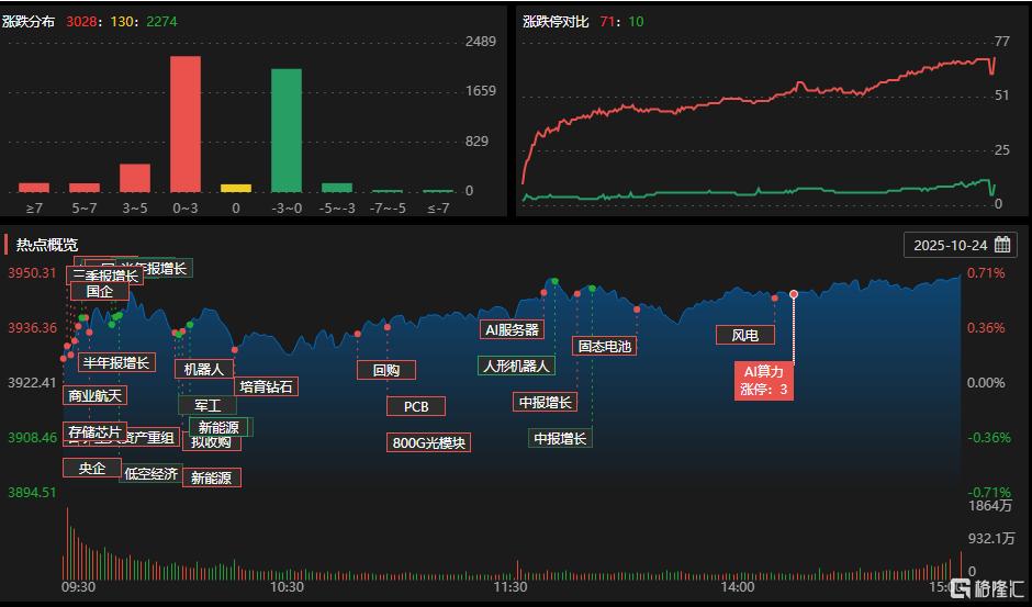 10月24日,沪指创10年新高,创业板指领涨。全市场成交额1.99万亿元,较前一交易日增量3309亿元,超3000股上涨。存储芯片、CPO、半导体等板块涨幅居前,煤炭、油气等下跌。