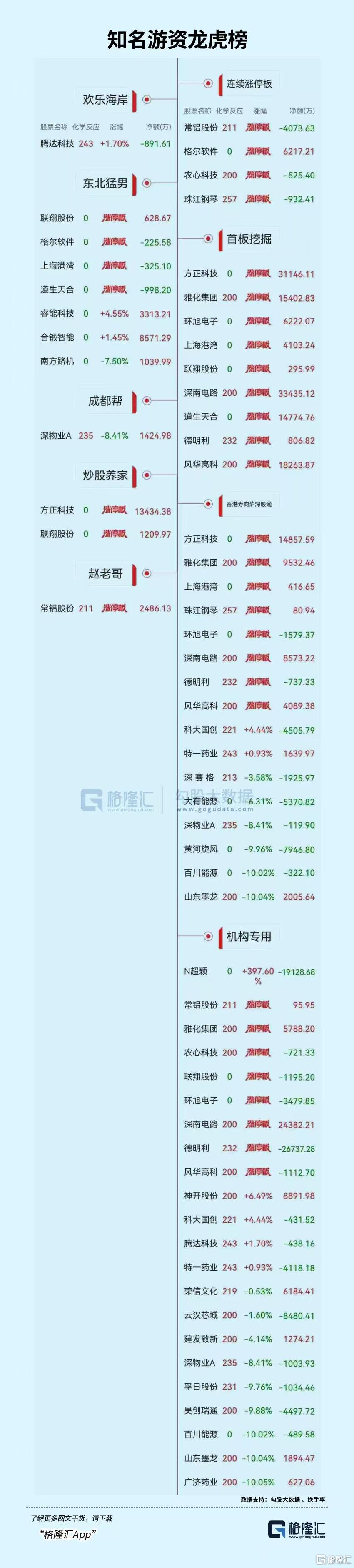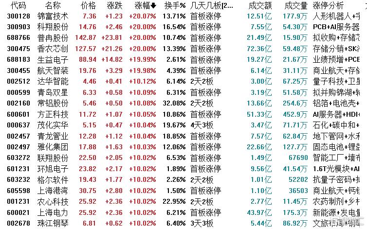 焦点股方面,盈新发展一字涨停晋级5连板,氯化亚砜概念股世龙实业4连板,低价股珠江钢琴、平潭发展均走出6天4板,跨界AI的法狮龙7天4板。