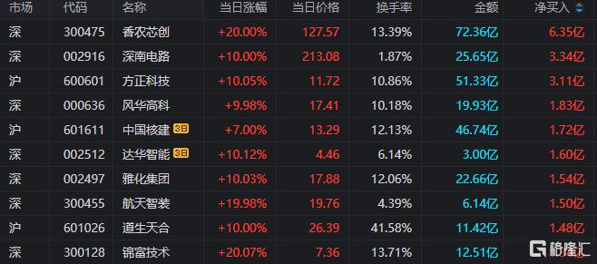 龙虎榜单日净买入额前三为香农芯创、深南电路、方正科技,分别为6.35亿元、3.34亿元、3.11亿元。