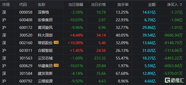 龙虎榜单日净卖出额前三为深赛格、安泰集团、黄河旋风,分别为1.37亿元、1.04亿元、1.01亿元。