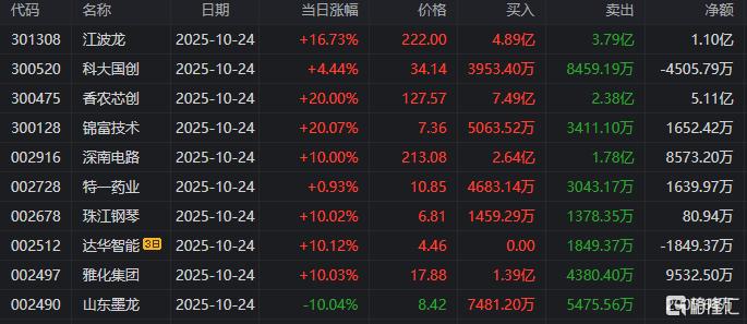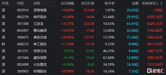 龙虎榜中涉及机构专用席位的个股中,当日净买入额前三为深南电路、神开股份、江波龙,分别为1.98亿元、6595.20万元、6029.23万元。